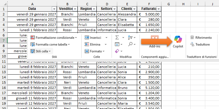 Per capire concretamente come Copilot possa supportare il lavoro in Excel, consideriamo un esempio pratico. Immaginiamo di avere una tabella contenente dati di vendita, organizzati per nome del venditore, nome del cliente, classe di prodotto, regione e altre informazioni rilevanti. Grazie all’Intelligenza Artificiale, è possibile chiedere a Copilot di analizzare questi dati passo dopo passo: generare riepiloghi, individuare trend di vendita, confrontare performance tra regioni o prodotti, e persino proporre grafici o scenari ipotetici, tutto senza scrivere una sola formula complessa.