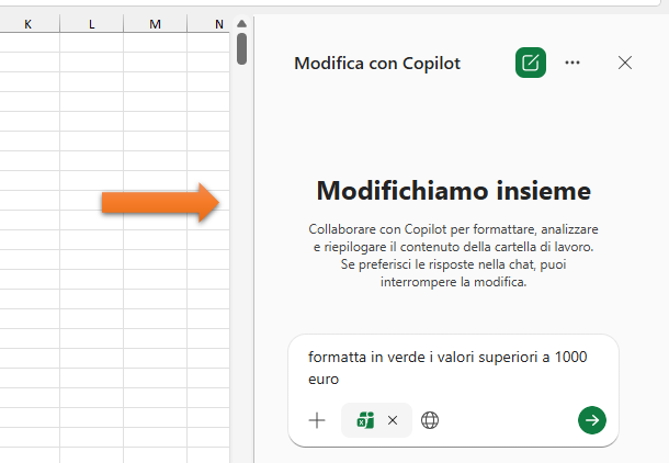 A seguito di questa azione, Excel mostra sul lato destro un riquadro di Copilot che permette all’utente di porre domande (prompt) in linguaggio naturale e ottenere analisi, riepiloghi e visualizzazioni basate sui dati del foglio attivo.