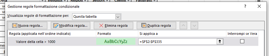 Selezionando l’area dei dati e accedendo al comando Formattazione condizionale → Gestisci regole, è possibile aprire la finestra di dialogo mostrata di seguito.