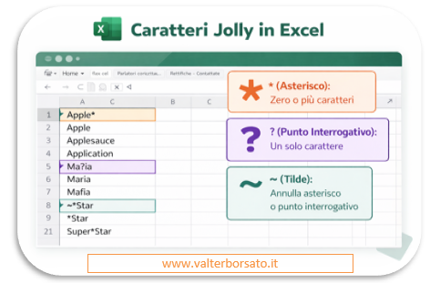 Tra i più utilizzati c’è l’asterisco (*), che rappresenta zero o più caratteri, permettendo di individuare tutte le celle che iniziano, terminano o contengono una certa sequenza di lettere.