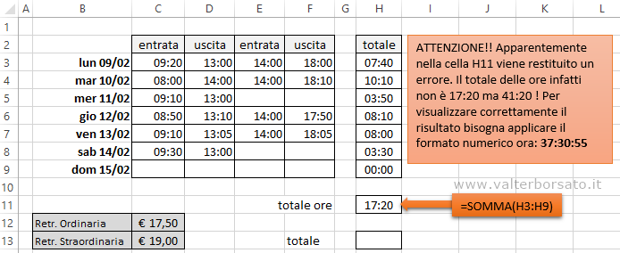 A titolo di esempio viene proposto un calcolo delle ore di lavoro svolte su una base settimanale, ovviamente l'esempio può facilmente essere declinato su un periodo di tempo di durata diversa.