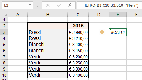 Funzione FILTRO un valore "Neri" non presente nella colonna B3:B10. Il