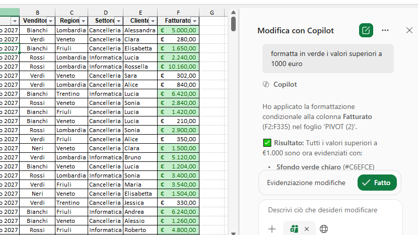 Nel caso specifico, a Copilot viene semplicemente chiesto: “Formatta in verde i valori superiori a 1000”.