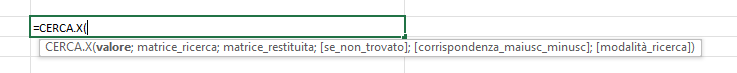 =CERCA.X(Valore;matrice_ricerca;matrice_restituita;[se_non_trovato];[corrispondenza_maiusc_minusc];[modalità_ricerca])
