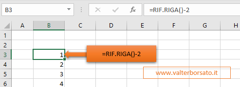 Nella cella B3 può essere inserita la seguente Funzione: =RIF.RIGA()-2