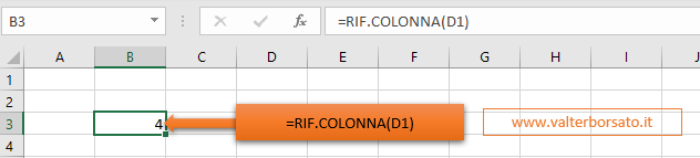 Nella Cella B3 è inserita la Funzione =RIF.COLONNA(D1), il cui