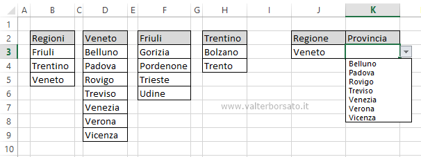 Come risultato finale del menu dinamico la cella K3 sarà subordinata alla K2 e fornirà l'elenco delle città della sola regione scelta.