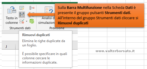 All'interno del gruppo Strumenti dati cliccare si Rimuovi duplicati