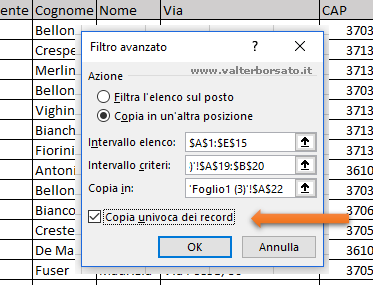 Creare una nuova tabella con i soli dati univoci applicando un Filtro avanzati