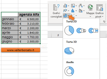 cliccare sul pulsante Inserisci grafico a torta o anello, nel